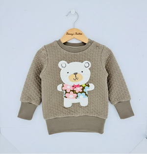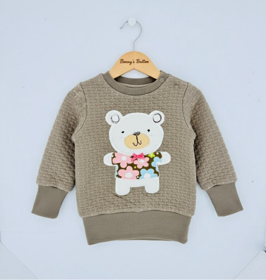 Elevate your child's everyday style with this charming and cozy Quilted Teddy Bear Sweater. Crafted in a sophisticated, versatile earth-tone taupe, this piece features an appealing diamond-quilted texture for added warmth and visual interest. The centerpiece is a delightful white teddy bear appliqué wearing a vibrant, floral-patterned top. Designed for comfort and easy layering over a turtleneck, this pullover blends playful cuteness with a subtle, fashionable palette, making it a perfect essential for cooler weather.