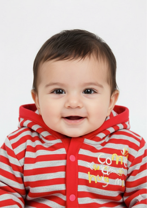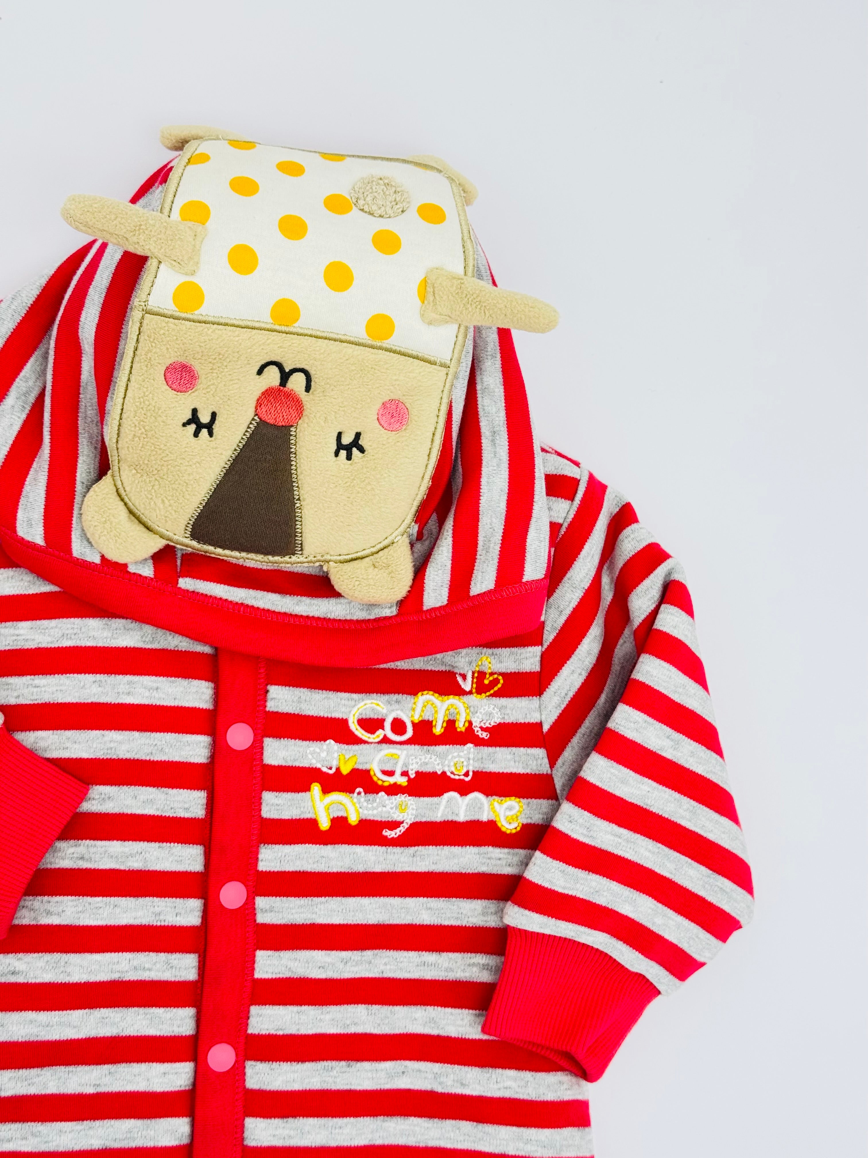 This charming romper features bold vibrant shoking pink and grey stripes with a cozy hood, crafted by the renowned international Korean brand Malimarihome. Its soft fabric and snap-button design ensure easy wear and comfort for infants. Perfect for chilly days, it’s a stylish essential for your little one.