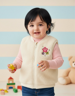 Introduce delightful warmth and style with our Floral Embroidered Sherpa Fleece Zip-Up Vest. Crafted from sumptuously soft sherpa fleece, this vest provides an extra layer of cozy comfort without restricting movement, making it perfect for playful days. The charming floral embroidery adds a touch of delicate elegance, ensuring your little one is both snug and stylish for any occasion.