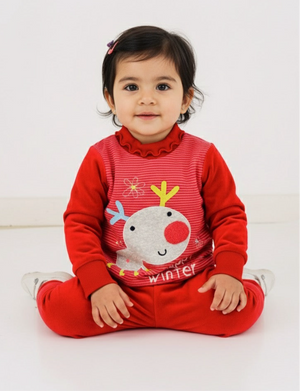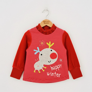 • Color: Main body in pinkish-red with thin lighter stripes. Sleeves are solid red. Reindeer graphic is grey with a red nose, yellow antlers, and blue details. White "happy winter" text.