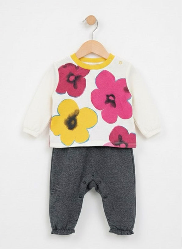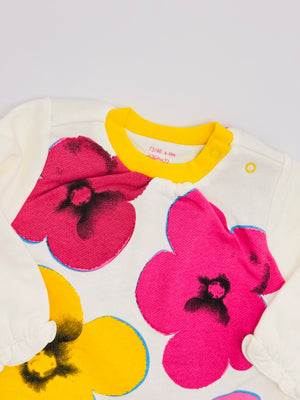 • Details: Vibrant graphic floral print, elasticated cuffs on sleeves and legs, convenient snap closures along the bottom for changing.