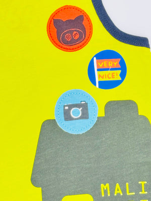 • Design Elements: The tank top features a unique graphic of a dark house with "MALI MARI HOME" text, adorned with playful, colorful badges including a black cat, a camera, and a "REAL HAPPY" motif.