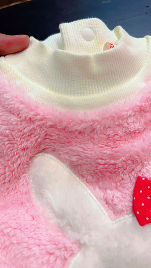 • Color: Pink plush overlay, white underlayer, white bunny with red bow.