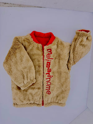 • Color: Warm, natural light brown (camel-toned) shaggy sherpa fleece. Features a striking red ribbed collar and a red zipper tape with matching red embroidery.