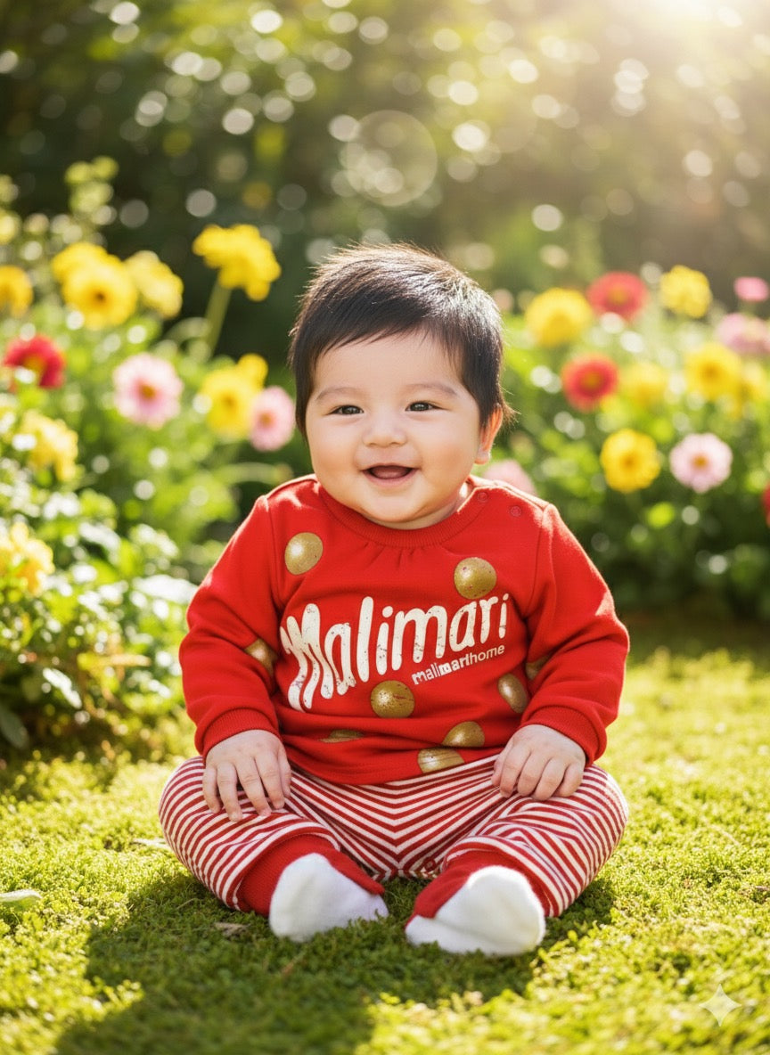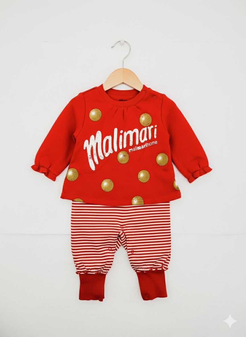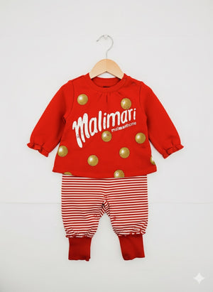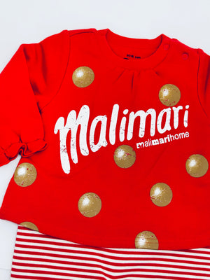 • Design Elements: The top features prominent gold polka dots and a large white "Malimari" logo. The bottom of the romper showcases timeless red and white horizontal stripes.