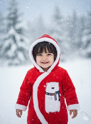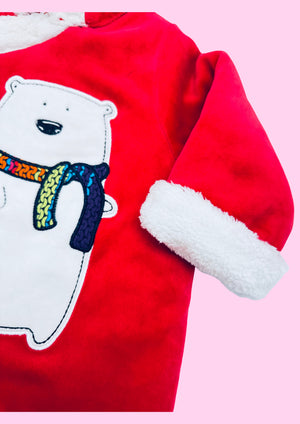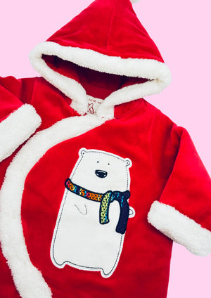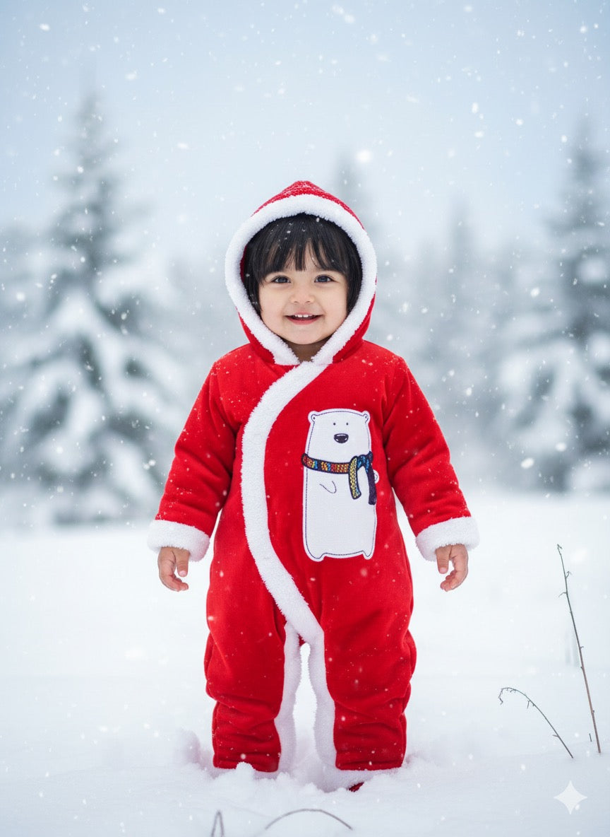 Embrace your winters with our Red velvet Polar Onesie, a cozy masterpiece featuring a playful polar bear design and plush lining, perfect for your little one’s winter wardrobe. Its an international Korean brand Named "Malimarihome" outfit, very cozy comfort giver for ur bunny with 100% organic cotton inner