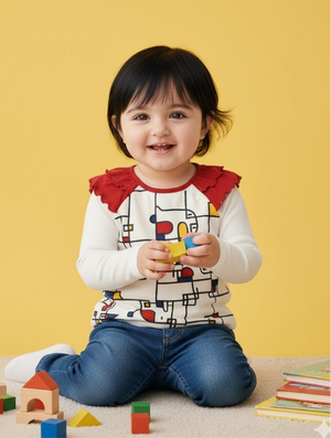 Infuse art and color into your child's wardrobe with this captivating Abstract Geometric Print Long-Sleeve Top. Featuring a vibrant, Mondrian-inspired design and charming ruffled shoulders, this top offers a unique blend of creativity and comfort. Crafted from soft, breathable fabric, it's perfect for making a stylish statement on any day.