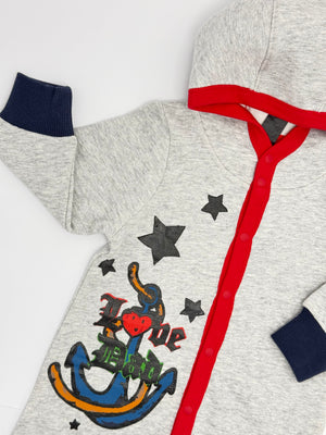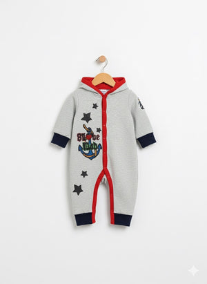 This premium quality 100% organic cotton Sea Marine Stylo Romper is perfect for both boys and girls. Its stylish design features grey fabric with red lining and black cuffs, making it suitable for autumn and winter. Designed by a renowned Korean brand, this romper is a must-have for any child's wardrobe.
